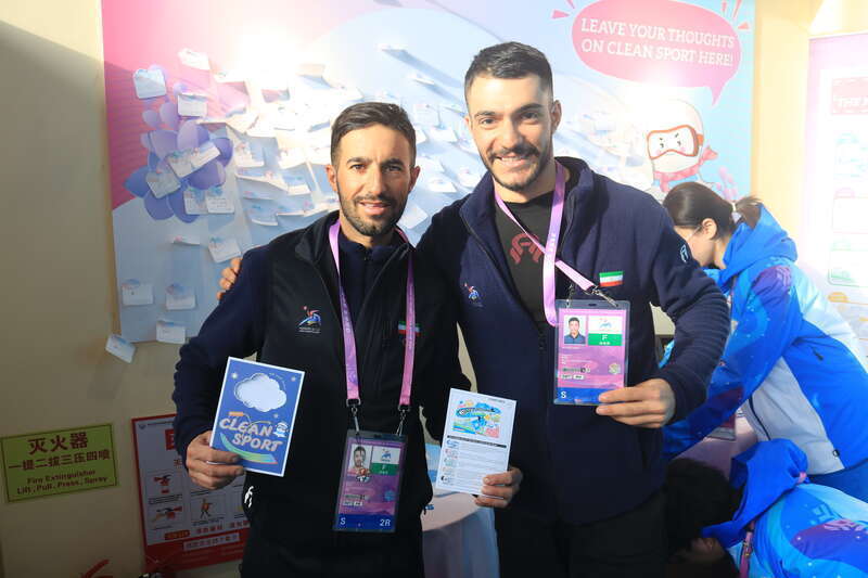 哈尔滨亚冬会,伊朗运动员在反兴奋剂拓展教育站展示宣传品。中国反兴奋剂中心供图